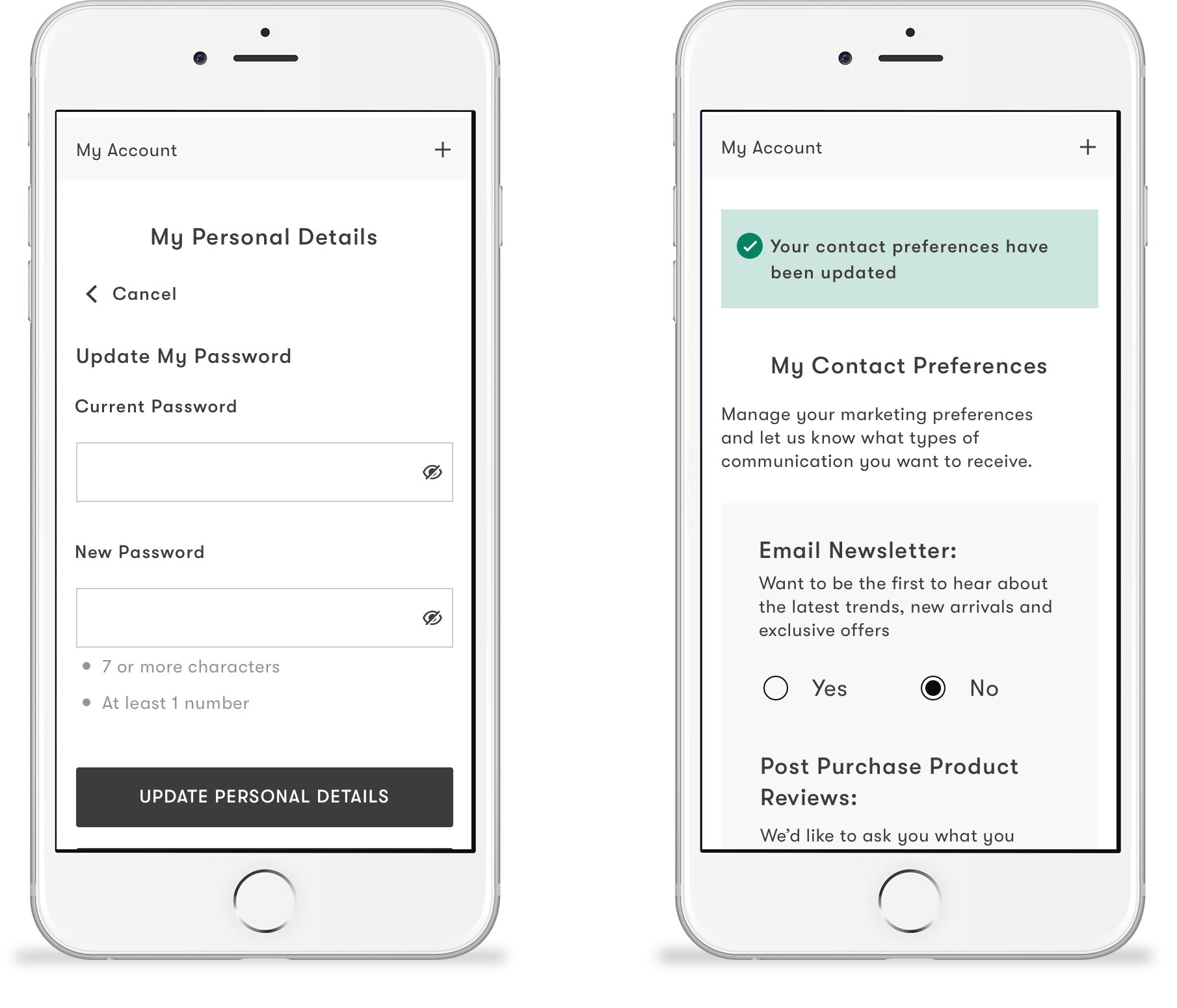 I was one of two product designers working on a redesign of the My Account site area, which was the first section to be tackled as part of a wider site re-platform. I made several UI/UX improvements to the existing design rooted in best practices, as follows: