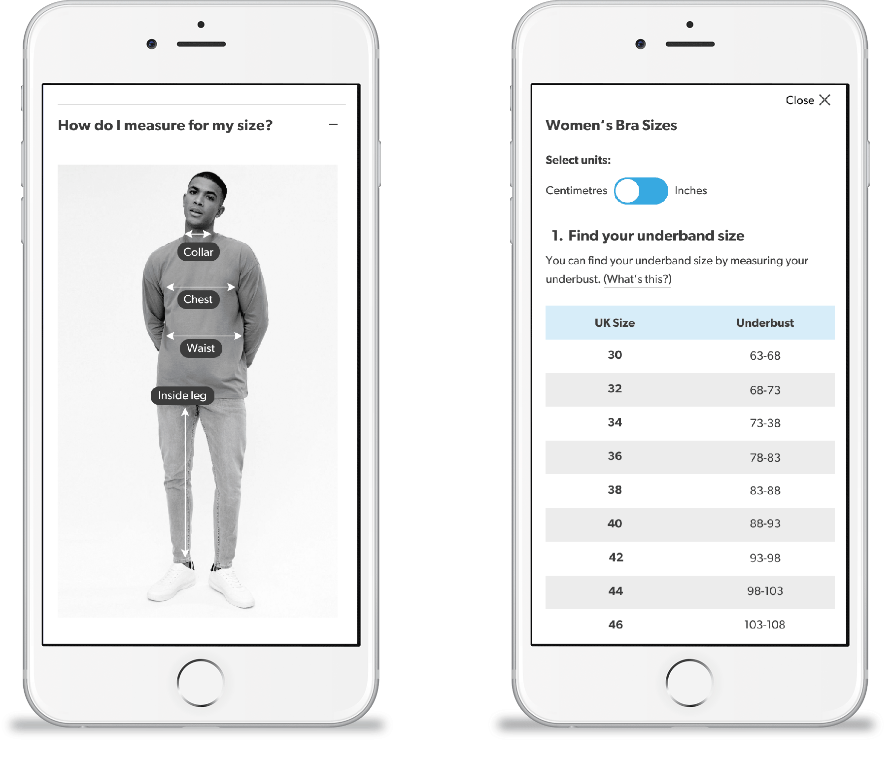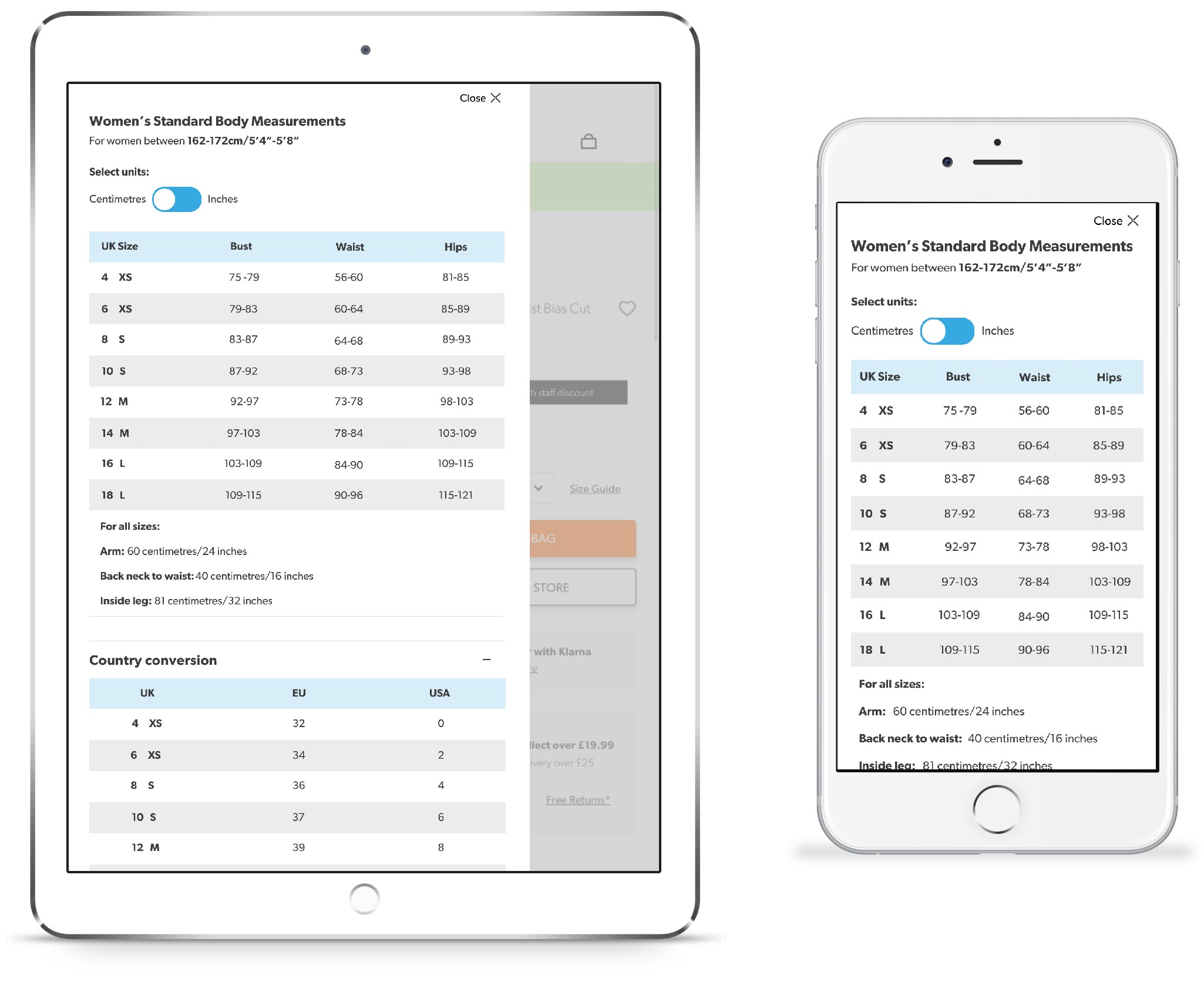 I worked closely with the buying team to identify which sizing information was most pertinent for customers when purchasing. Based on these conversations I added some new measurements that were not previously accounted for to my design, while ensuring that customers were only shown information relevant to the product category they were browsing in a consice and easily digestible format. This was a departure from the previous size guide which displayed measurements for all categories simultaneously, thus causing overwhelm for customers. The reduction in information also made it possible to remove horizontal scrolling on mobile devices.