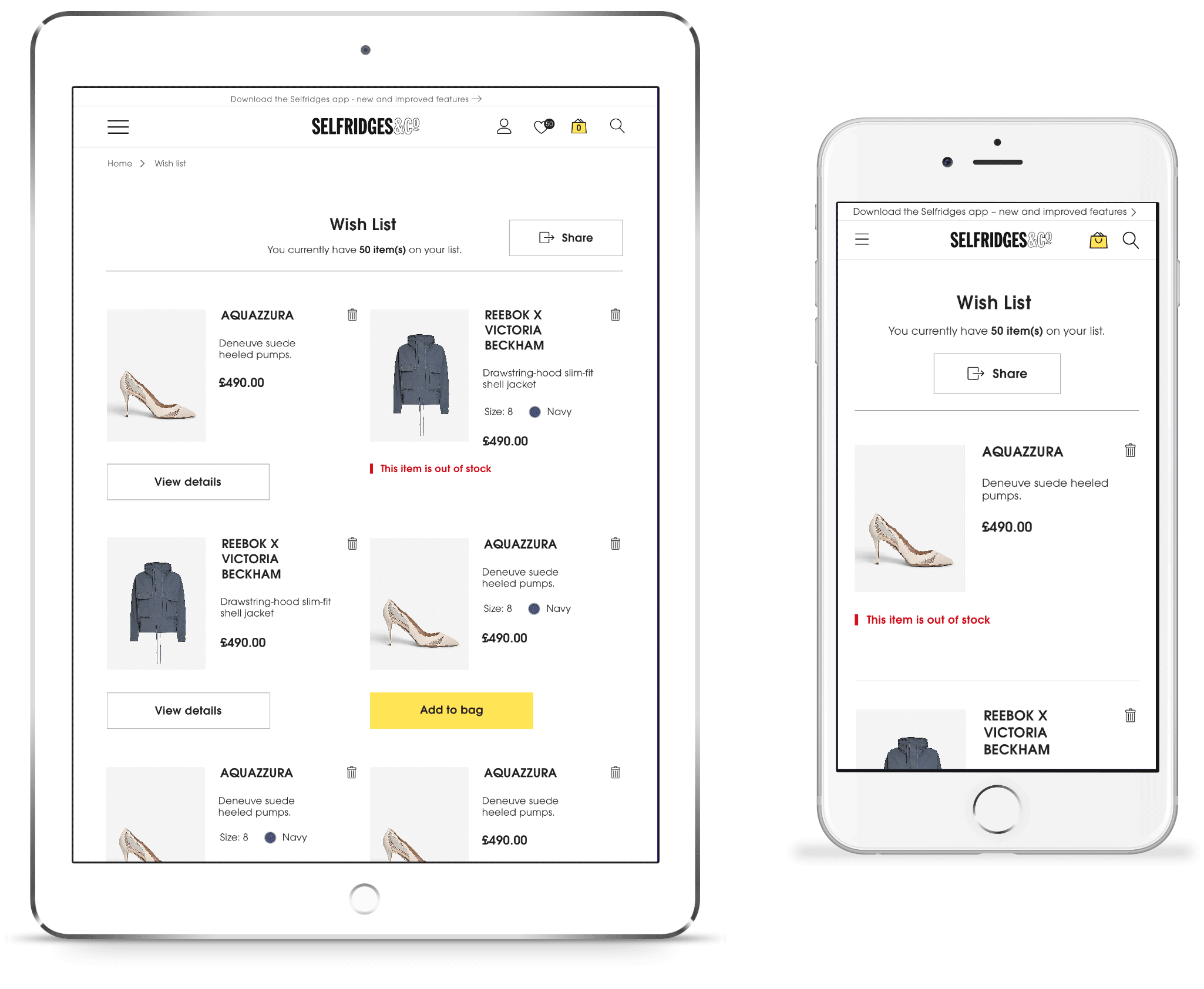 A revamped customer account section included an improved Wishlist, which allowed customers to quickly see which previously-saved items were still available and add them to their basket.